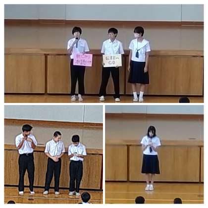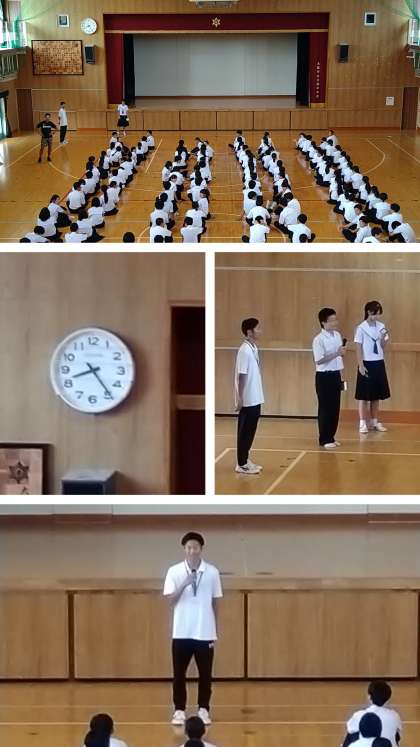 続いて、図書委員会、生活委員会、保健委員会、委員長会より、今月の目標などの声掛けがありました。(暑さのせいで、カメラ機能が途中で停止したため、写真の撮れかった委員会がありました。「申し訳ありません!」)