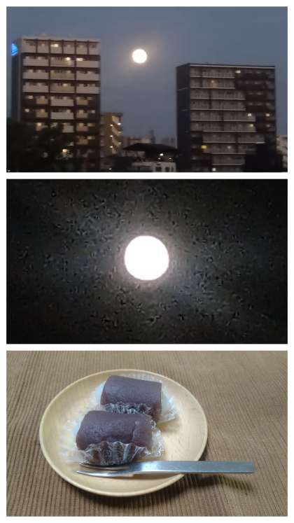 源八橋から見えた名月と、お家で食べた月見だんごです。「うまっ!」
