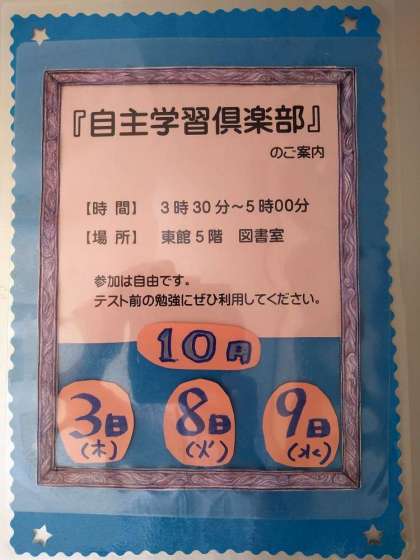 明日より、2学期『中間テスト』1週間前となり、部活動も休止となります。北稜元気アップ主催で『自主学習倶楽部』として図書室を放課後開放します。
