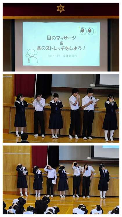 ◯保健委員会からは、『目や首のマッサージ・ストレッチ』についての実演【一番上の写真】。