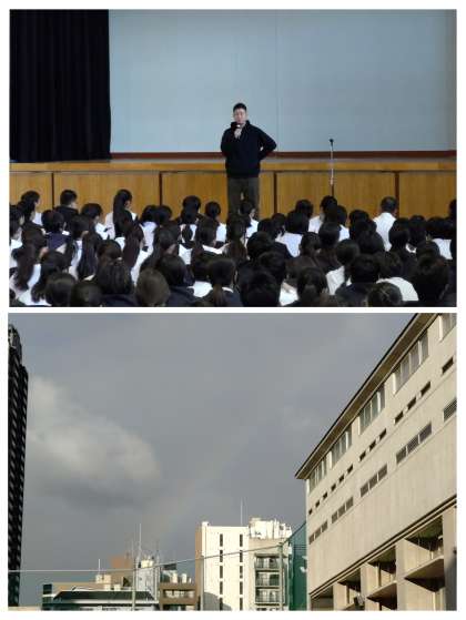 今朝は、ぱらぱらと雨が降りながらも太陽の明かりが注いでいるような天候でありました(写真下:虹わかりますか?)ので、全校朝礼は体育館で行いました。