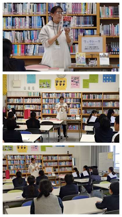 本日、昼休みの時間帯で学校司書の樫尾さんによる『ブックトーク』が開催され、熊谷はるか著「JKインドで常識ぶっ壊される」と桑原功一著「フリーハグ」の本が紹介されました。