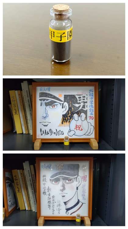 いただいた『甲子園の土』は、本校卒業生で『巨人の星』の作者である川崎のぼる先生の色紙の前に飾っておこうと思います。