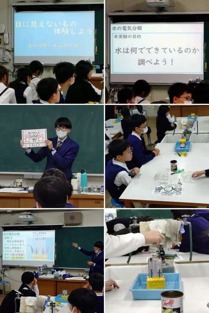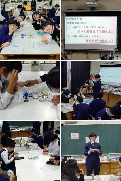 『理科』⇒水の電気分解の実験をしました。「この気体は、本当に水素なの?」「本当に酸素なの?」チャッカマンや線香の火を使って確認!ほとんどの班が実験は成功したようです。
