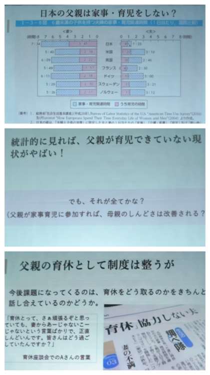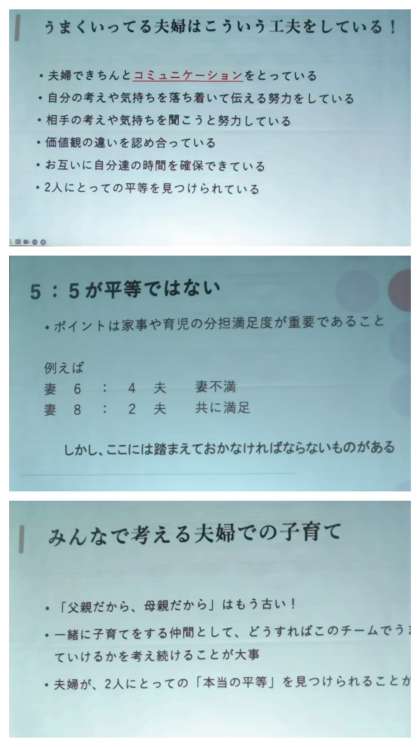 「父親の育児」や「みんなで考える夫婦の子育て」などについて話し合いました。生徒からは様々な意見が出て、講師先生から「皆さん、夫婦してるんですか?」との感想。