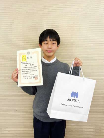 本校、1年生の多田一成さんが株式会社モリタ【モリタ賞】に選ばれ、表彰状と記念品が授与されました。「おめでとうございます!」