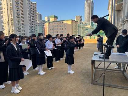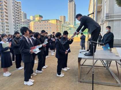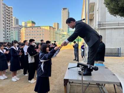 昨日、全校朝礼がありました。はじめに、賞状の伝達(税の作文・男子テニス部・サイエンス部)がありました。続いて校長先生から自転車の「ながらスマホ」についてのお話がありました。