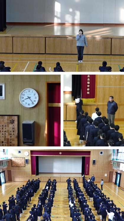 今朝は、1年生の学年朝礼がありました。今週の金曜日(24日)の4限目に『防災教室』を行うため、今日はその時の活動班での集合となりました。