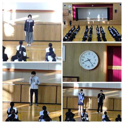 皆さんが、仮に他校に応援に行くとしても、今の北稜中学校のルールを守って行動する(制服で、そしていらないものは持って行かない)ようにしてくださいという内容のお話がありました。