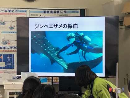 アシカの体重を測定する様子やジンベエザメの採血する様子など、普段見られない貴重な映像を見ながら勉強しました。