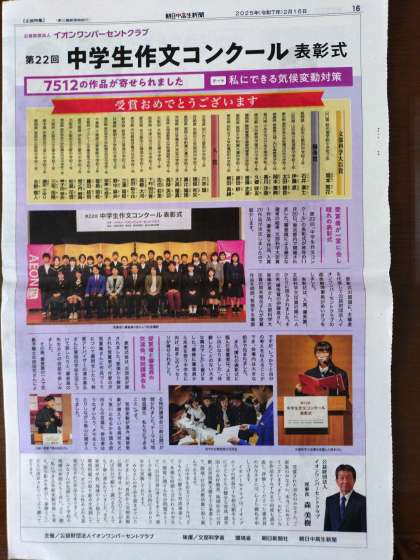 その時の様子が、朝日新聞・朝日中高生新聞・公益財団法人イオンワンパーセントクラブの冊子に掲載されました。