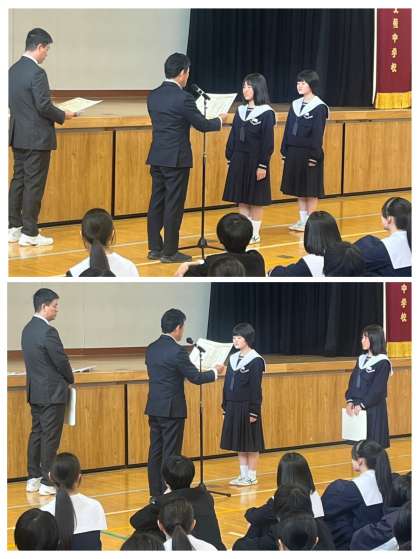 本日、令和6年度の『修了式』を行いました。はじめに表彰伝達があり、2名の生徒が『教育長表彰(全国大会やコンクールで3位以内が条件)』を受賞しました。