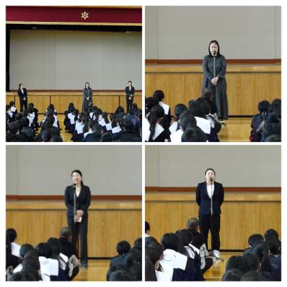 最後に、今年度末で転勤される先生方(正木先生・川邉先生・板東先生)の『離任式』を行い、ご挨拶をいただきました。3名の先生ともに10年間ご勤務されました。「本当に長い間お世話になりました!」