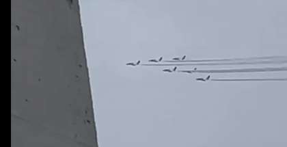 本日は本番と同じ時間帯、同じ飛行ルートでの予行飛行ということで、大阪城上空を通過するブルーインパルスを、北稜中学校上空でも見ることができました。