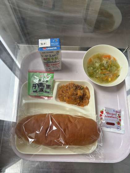 今日の献立は、コッペパン、いちごジャム、じゃがいものミートグラタン、レタスのスープ、ソフト黒豆、牛乳です。