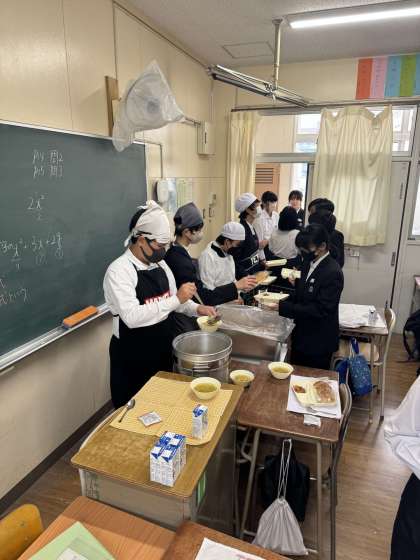 手際よく配膳が行われ、生徒たちも笑顔で給食を受け取っていました。