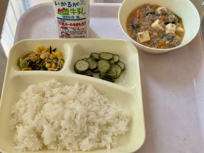 本日の給食では、マーボーどうふ・きゅうりの中華あえ・ツナとチンゲンサイのいためもの・ごはん・牛乳が提供されました。