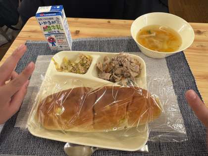 きょうの給食は、豚肉のガーリック焼き、スープ、ツナとキャベツのソテー、おさつパン、牛乳という彩り豊かな献立でした。