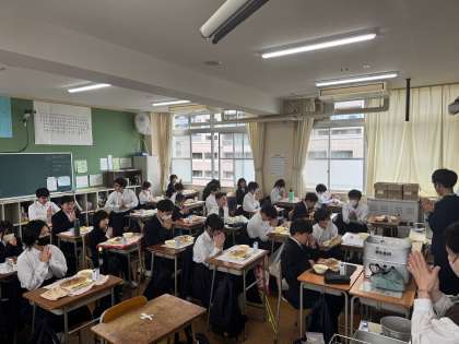 1年3組では配膳係が声を掛け合いながら丁寧に盛りつけ、教室には香ばしいガーリックの香りがふんわり。