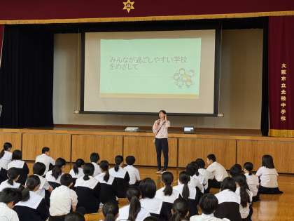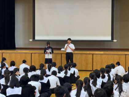 最後に、3年2組の学級委員長が登壇し、「修学旅行まであと1か月。クラスの仲をさらに深めよう」と呼びかけ、実力テストへ向けた計画的な学習も促しました。