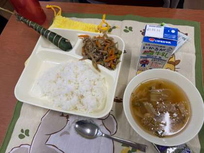 きょうの給食は「こどもの日」の行事献立で、きんぴらちらし・五目汁・ちまき・抹茶大豆・牛乳という和のメニューでした。
