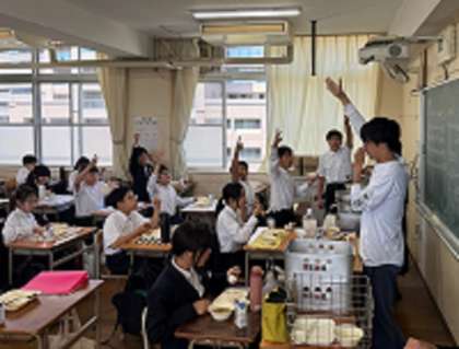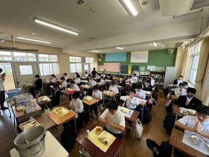 1年3組は4限目に体育があったため配膳開始が遅れましたが、生徒たちは息の合ったチームワークで手際よく準備を進め、ほぼ通常時間通りの「いただきます」を迎えることができました。