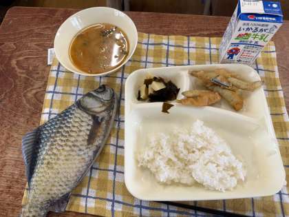 きょうの給食(きびなごの天ぷら、わかたけ煮)