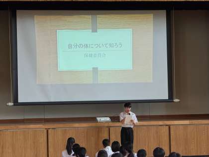 続いて保健委員会が「じぶんのからだについて知ろう」というクイズ形式の報告をスライドで行い、デジタルを生かした分かりやすい発表で集会を盛り上げました。