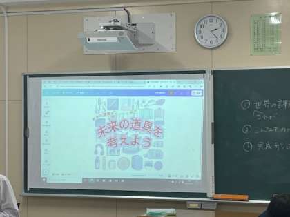 万博校外学習の事前学習で、SDGsについて学んだことを活かし、グループで「持続可能な暮らしのために必要な未来の道具」について考えています。
