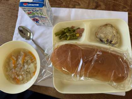 きょうの給食は、かつおのガーリックマリネ焼き、押麦のスープ、グリーンアスパラガスのソテー、コッペパン(ブルーベリージャム付き)、牛乳でした。