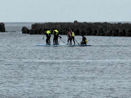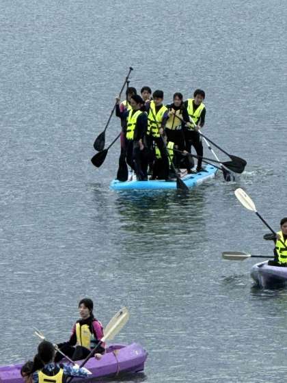 マリン体験班のSUP(スタンドアップパドルボード)では、最初はぐらついていた生徒たちも、インストラクターの助言を受けながら次第にボードの上にしっかり立てるようになりました。