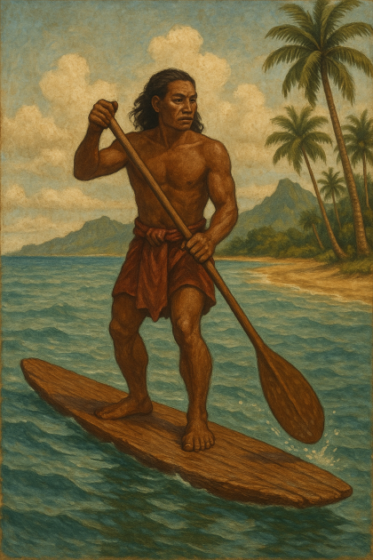 SUPは、古代ポリネシアの人々が外洋を渡る際、立って漕いだのが起源とも言われます。
