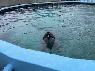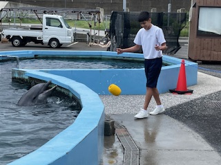 生徒が投げたボールを上手にキャッチしたイルカが、こちらに投げ返してくれています。