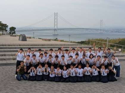 明石海峡大橋をバックに、修学旅行最後の思い出を飾る1枚が撮れました。