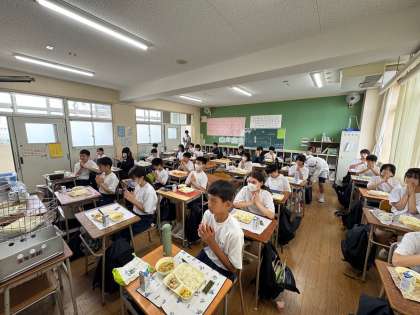 1年1組は体育のあとすぐの配膳でしたが、クラス全員で声をかけ合い、手際よく準備を進めて「いただきます」ができました。