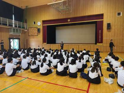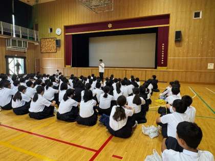 講話担当の先生から「入学から2か月が過ぎ、ようやく学校のリズムに慣れてきましたね」と切り出し、部活動や地域クラブでがんばる生徒たちをねぎらいました。