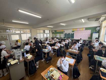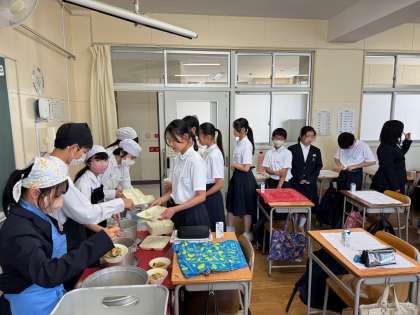 1年4組では配膳当番が丁寧に盛り付けを進めましたが、手際に時間がかかり「いただきます」がやや遅れ気味に。