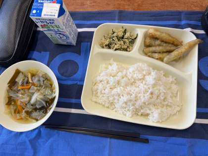 きょうの給食は、いわしの天ぷら、五目汁、とりなっぱ炒め、ごはん、牛乳でした。