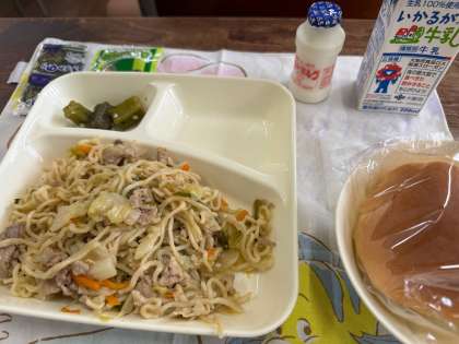 きょうの給食は、和風焼きそば・きざみのり・オクラのかつお梅風味・まっ茶大豆・発酵乳・ミニコッペパン・牛乳でした。