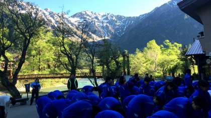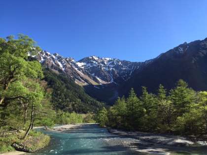 澄み渡る青空に穂高連峰の山並みが映えます。