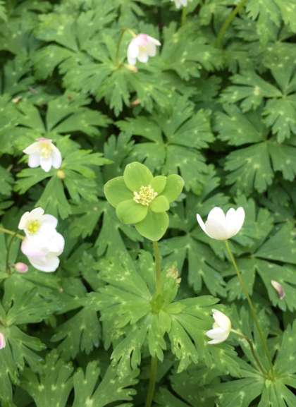 通常は茎に白い花をつけるのですが、葉のような緑色の花弁の個体を見つけました。