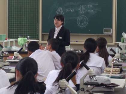 5月25日(水)、1年生の理科で教育実習生による初めての授業をおこないました。授業の内容は、「茎の維管束の観察」でした。顕微鏡でトウモロコシとムクゲの茎の横断面を観察し、スケッチするものでした。