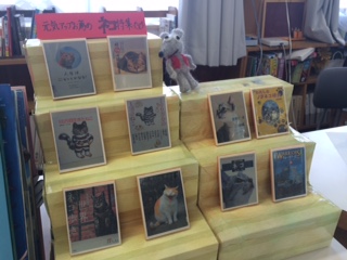 「元気アップおすすめミニ本コーナー」ということで、手のひらサイズの「ミニ本」を作成していただきました。今回の特集は「ねこ特集」です。「ミニ本」の裏にはあらすじ等が書かれており、生徒にさまざまな本を紹介しています。