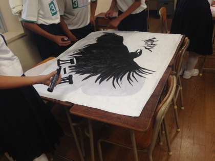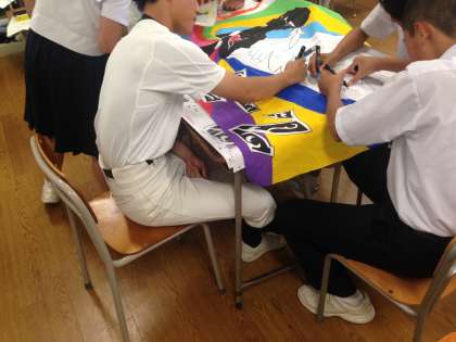 体育大会で使う、応援旗を作っています。主に放課後の作業で、白い旗に学級で選んだデザインをクラスのメンバーで協力して描いています。