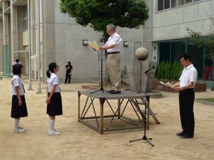 本日、全校朝礼において、先日紹介いたしました「第七回天神祭献詠短歌大賞」の表彰状の伝達を行いました。