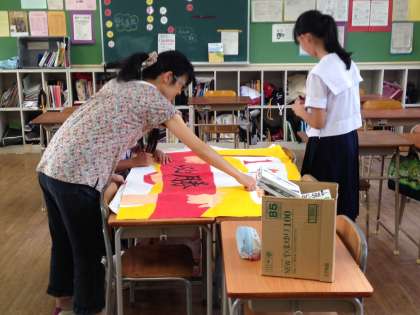 本日放課後、1年3組での体育大会の学級応援旗づくりのようすです。
