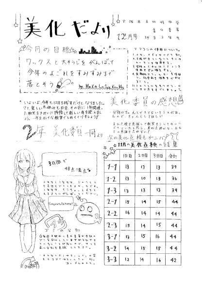 美化委員会から「美化だより」が発行され、11月の美化点検の結果が発表されました。12月の結果はどうなるでしょうか。
