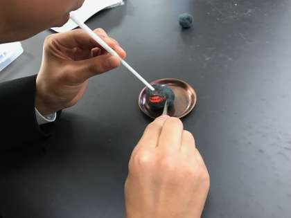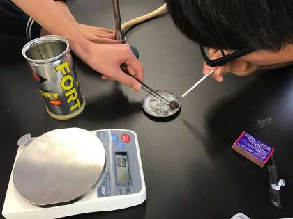 2年生の化学実験「鉄の燃焼」です。鉄の質量と化合した酸素の質量の関係性を調べます。写真はスチールウールに着火して、ストローで空気を送って内部まで燃焼させているところです。
