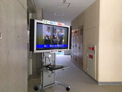 朝の登校時間と昼休みの時間に合わせて、保健委員会で作成した「T.T.K.Y」(正しく.手洗い.感染症.予防)の手洗いビデオを保健室前で放送しています。
