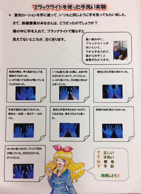 保健委員会で、手洗い実験しました。やはり、さっと洗うだけでは汚れが落ちないことがわかりました。